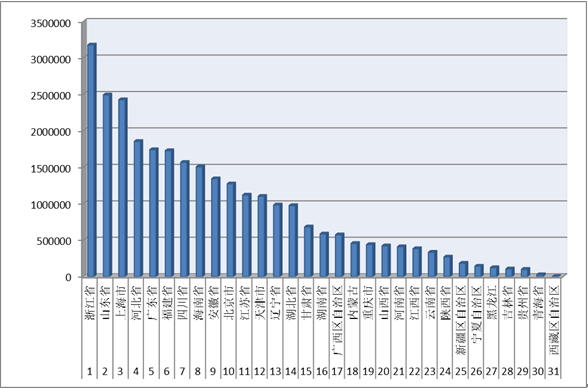 拍賣成交額在1-20億元的有7個?。▍^(qū)、市),分別是寧夏自治區(qū)、新疆自治區(qū)、貴州省、黑龍江省、吉林省、青海省和西藏自治區(qū)。